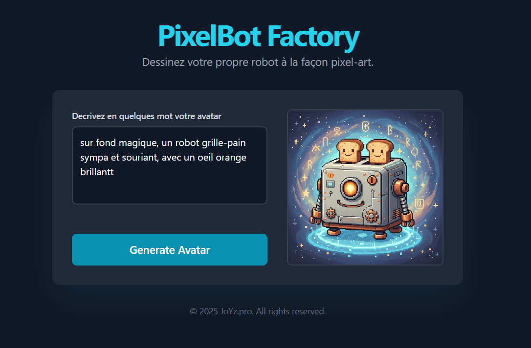 Actualités October 17, 2025 PixelBot-Favtory : Une usine à robots Un générateur de robot avatar au format pixel-art généré par IA. Lire l’article